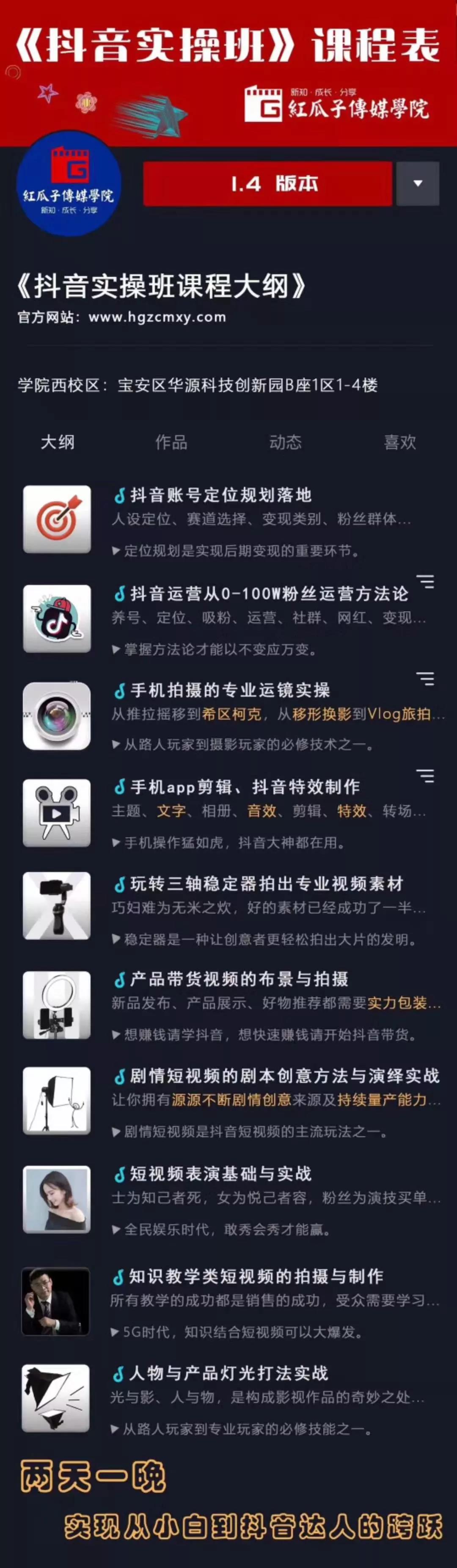 兩天一晚的培訓(xùn),讓你實現(xiàn)從小白到抖音達人的跨躍,本次培訓(xùn)的具體內(nèi)容包括以下10點